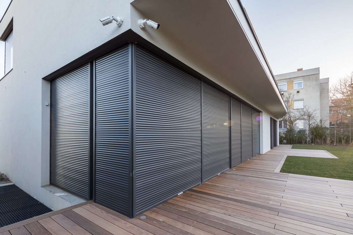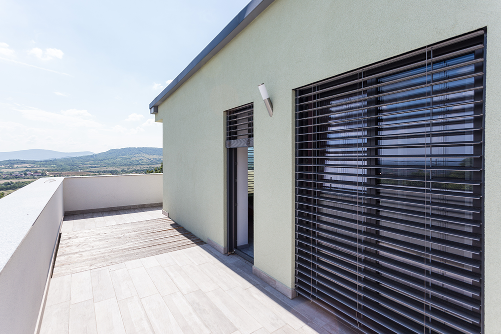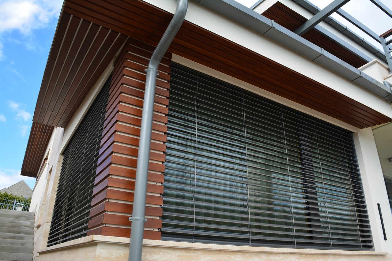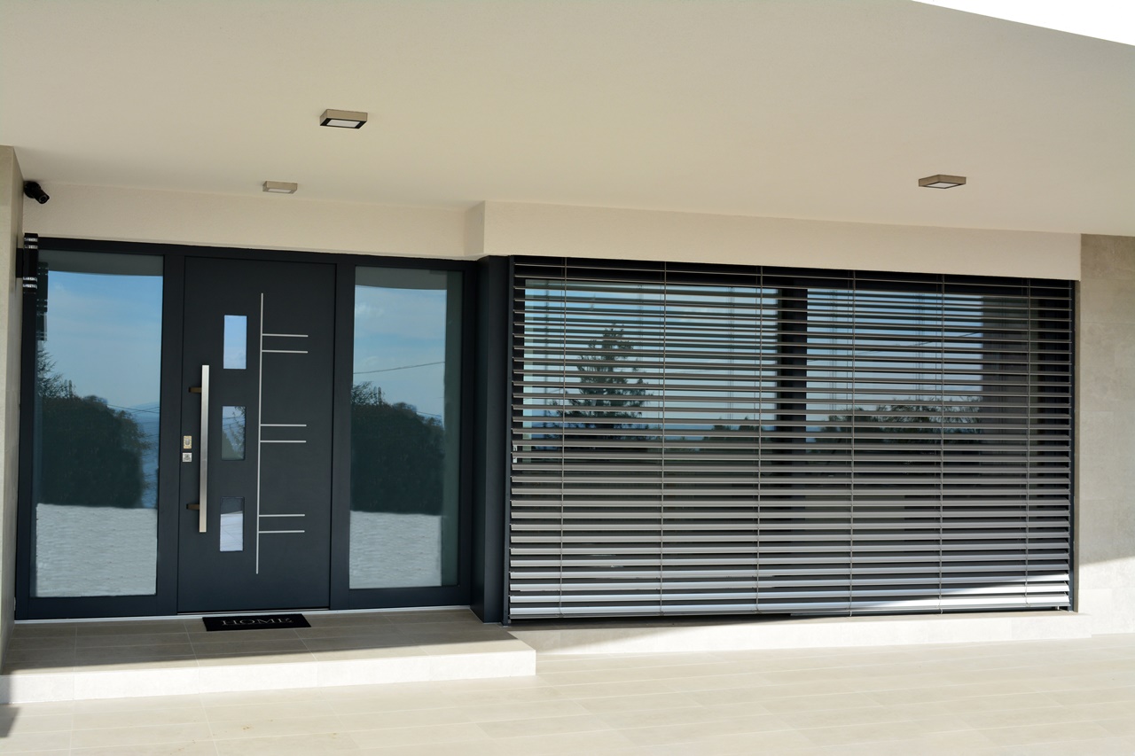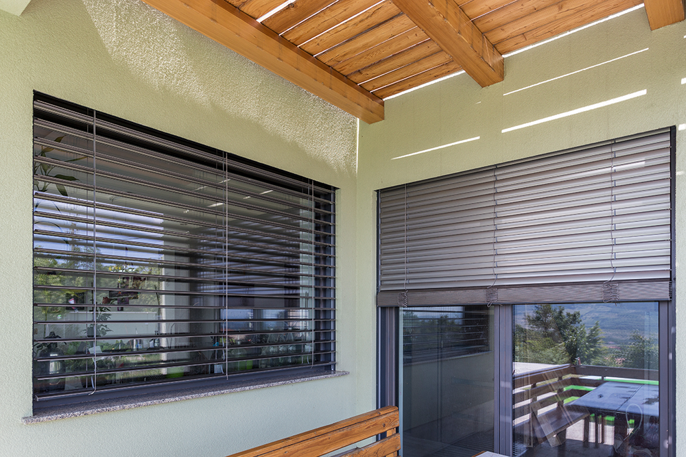 Элементы конструкции также можно выбрать в соответствии со стилем дома: ролеты с внешней коробкой, установленной вверху проёма, или со скрытой внутренней с автоматическим или ручным подъёмом из пластика или алюмитния.